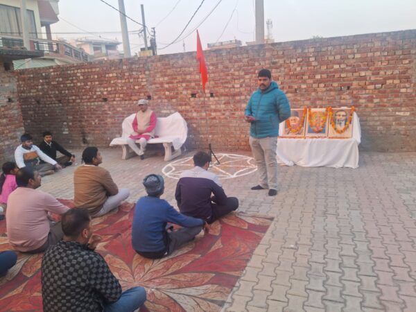 उन्होने कहा की संघ की स्थापना का सौ वा साल है प्रत्येक स्वंयसेवक को अपने आचरण मे सामाजिक समरसता ‘ परिवार प्रबोधन मे अपना भवन भजन भोजन भूषा भ्रमण संस्कृति के अनुरूप हो पर्यावरण संरक्षण हेतु जल जंगल जमीन पेड प्लास्टिक का ध्यान रखते हेतु दोहन करे। . देश हमारा है उससे पहले की हम देश के लिए है के दृष्टि गत अपने नागरिक कर्तव्यो का प्रयोग करे अपने जीवन में स्व का प्रयोग करते हुए स्वभाषा स्वरोजगार स्वधर्म स्वदेशी उत्पादो का प्रयोग करे। उन्होंने कहा कि संघ की शाखा व्यक्तिव निर्माण की कार्यशाला तथा सामाजिक परिवर्तन का आधार है हमे अधिक संख्या मे संघ शाखा मे जाना चाहिए। ‘हनुमान चालीसा का पाठ किया गया तथा सभी को हनुमान चालीसा पुस्तक भेट दी गयी। इस अवसर पर सैकडो श्रृद्धालुओ द्वारा खिचडी का प्रसाद ग्रहण किया।