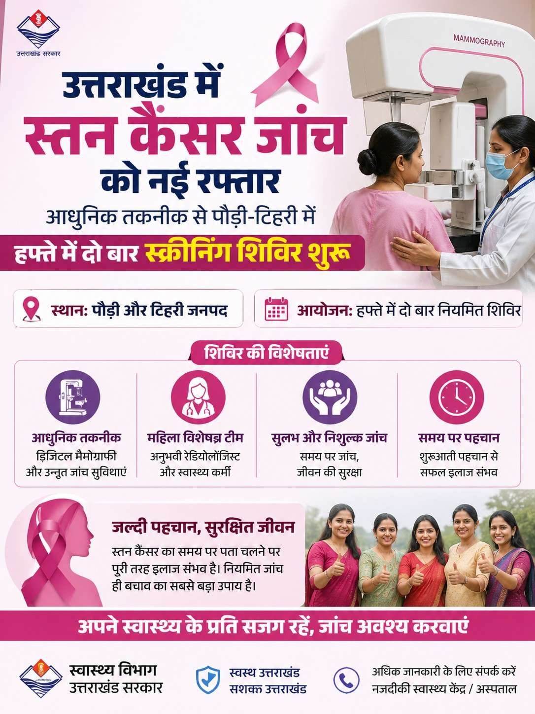 उत्तराखंड में स्तन कैंसर जांच को नई रफ्तार, आधुनिक तकनीक से पौड़ी-टिहरी में सप्ताह में दो बार स्क्रीनिंग शिविर शुरू, सचिव स्वास्थ्य सचिन कुर्वे ने कहा – दूरस्थ क्षेत्रों तक पहुंचाई जा रही हैं आधुनिक जांच सुविधाएं