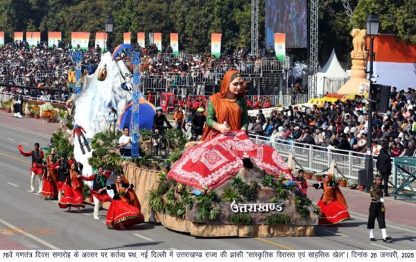 महानिदेशक सूचना बंशीधर तिवारी ने कहा कि कर्तव्य पथ पर गणतंत्र दिवस परेड में उत्तराखंड की झांकी में राज्य से 16 कलाकारों ने भाग लिया। झांकी में उत्तराखण्ड की सामाजिक, सांस्कृतिक और धार्मिक महत्व को दर्शाती प्रसिद्ध ऐपण कला, उत्तराखण्ड के साहसिक खेलों एवं साहसिक पर्यटन को चित्रित किया गया। उन्होंने कहा कि मुख्यमंत्री के निर्देशानुसार राज्य सरकार द्वारा सांस्कृतिक विरासत को बढ़ावा देने और साहसिक खेलों को राष्ट्रीय स्तर पर पहचान दिलाने के लिए गणतंत्र दिवस की परेड में झांकी के रूप में प्रदर्शित करने का निर्णय लिया गया।